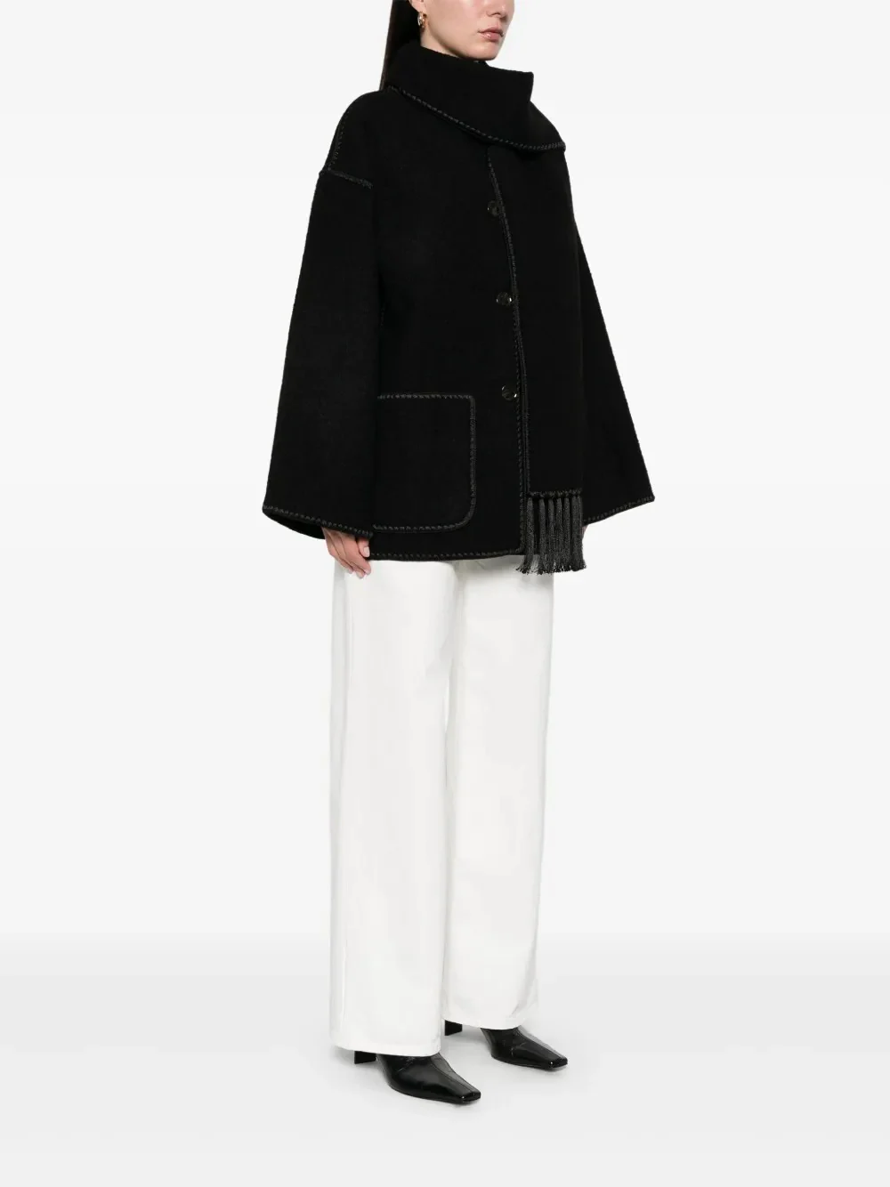 Cappotto Toteme con dettaglio sciarpa e chiusura frontale con bottoni.Dettagli in frange e rifiniture whipstitch donano un tocco artigianale e sofisticato.Due tasche a toppa anteriori per praticità e stile.Composizione sostenibile con lana vergine, lana riciclata e poliestere riciclato.Un capo elegante e contemporaneo, perfetto per completare look raffinati e attenti all’ambiente.